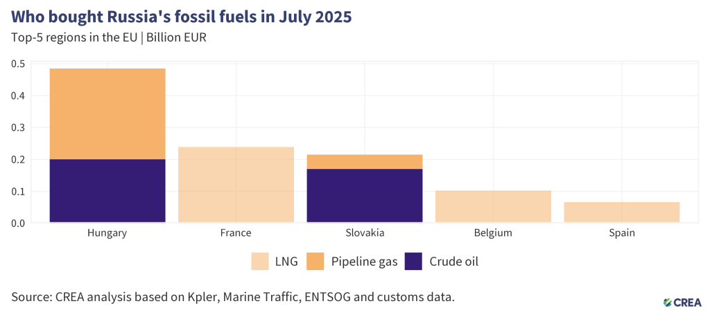 - In July 2025, the five largest EU importers of Russian fossil fuels paid a total of EUR 1.1 bn. The EU does not sanction natural gas, which accounts for over 67% of these imports and is mainly delivered by pipeline or as liquefied natural gas. The rest was mostly crude oil, which continues to flow to Hungary and Slovakia via the southern branch of the Druzhba pipeline under an EU exemption.