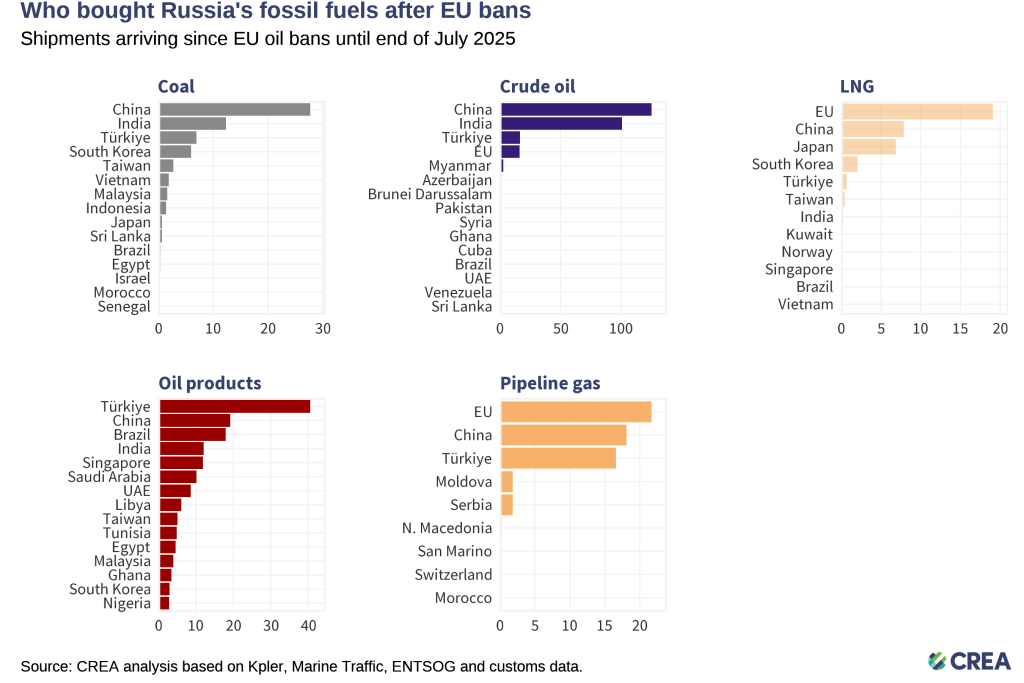 - Coal: From 5 December 2022 until the end of July 2025, China purchased 44% of all of Russia’s coal exports. India (20%), Turkiye (11%), South Korea (9%), and Taiwan (4%) round off the top five buyers list.