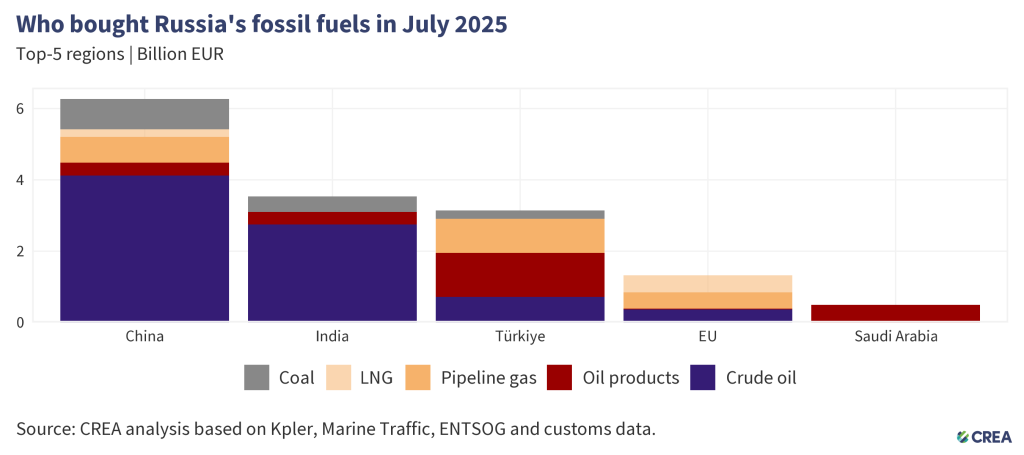 - China remained the largest global buyer of Russian fossil fuels in July 2025. Their imports accounted for 42% (EUR 6.2 bn) of Russia’s monthly export earnings from the top five importers. Crude oil comprised 66% (EUR 4.1 bn) of China’s imports from Russia.