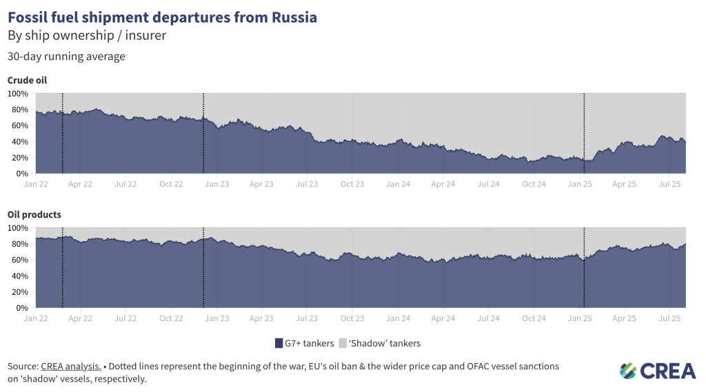 Over half Russian oil exports in July relied on G7+ tankers, but ‘shadow’ tankers continue to dominate crude oil exports