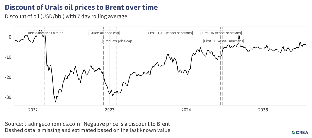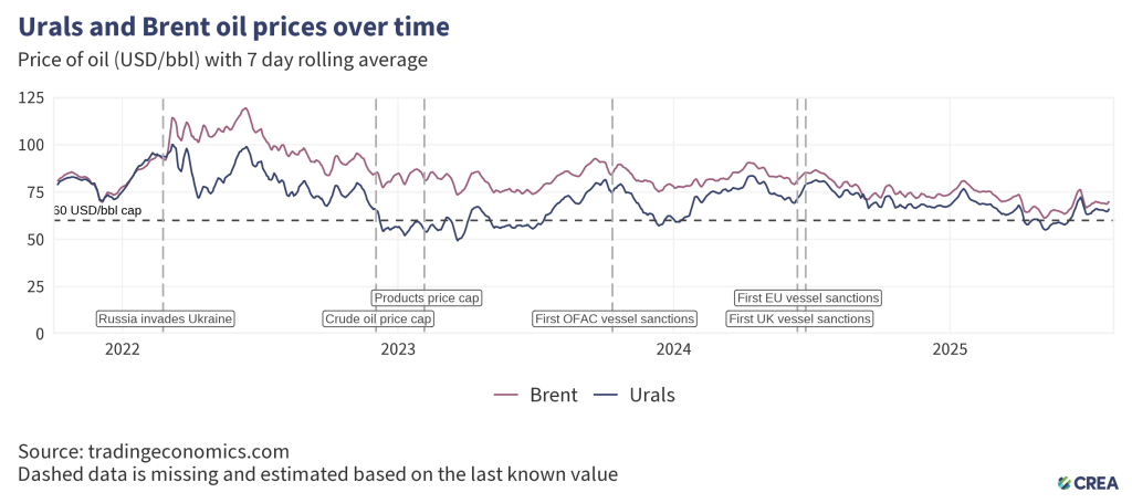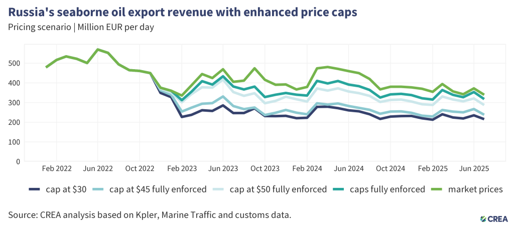- Since introducing sanctions until the end of July 2025, thorough enforcement of the price cap would have cut Russia’s export revenues by 11%. In July 2025 alone, full enforcement of the price cap would have reduced revenues by 6%.