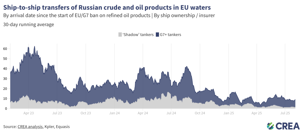 In July 2025, an estimated EUR 127 mn worth of Russian oil was transferred daily via ship-to-ship (STS) operations in EU waters — a 44 % decrease from the previous month. G7+ tankers conducted 86% of these transfers, while the rest involved ‘shadow’ vessels, which are often uninsured or registered under flags of convenience.