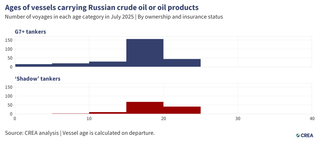 - In July 2025, 388 vessels exported Russian crude oil and oil products, of which 122 were ‘shadow’ tankers. A third of these ‘shadow’ tankers were at least 20 years or older.