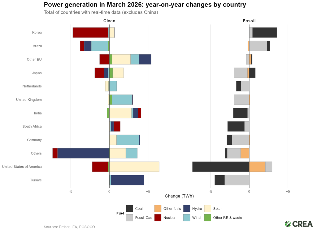 In the U.S. and India, growth in solar power was the single largest driver of the fall in fossil power generation; in South Africa and Turkiye, improved operation of nuclear and hydropower plants was the main driver. In the Netherlands and Germany, growth in wind power generation made the largest contribution.