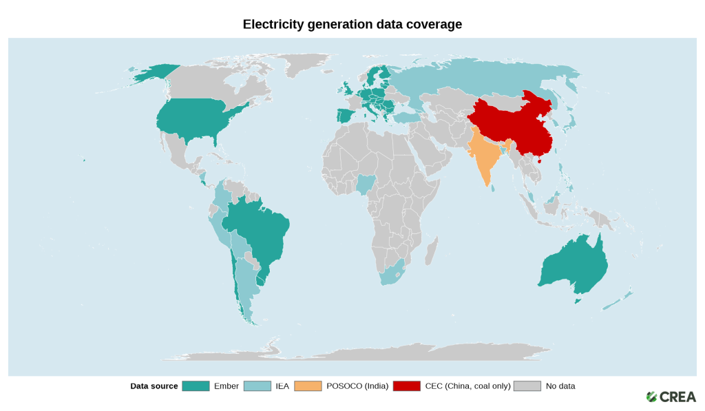 CREA compiled near-real-time power generation data from POSOCO, Ember, and the IEA to build as complete a dataset as possible. Coal-fired power generation in China was taken from the China Electricity Council’s weekly surveys. While there are significant omissions as many countries do not report data in a timely way, the dataset covers 87% of global coal power generation and over 60% of gas-fired power generation.