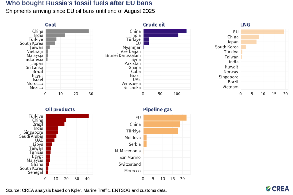 - Russia’s fossil fuel exports remain highly concentrated, with China dominating coal and crude oil purchases, Turkiye dominating purchases of oil products, and the EU still the largest buyer of LNG and pipeline gas — showing Moscow’s dependence on a narrow set of key customers.
