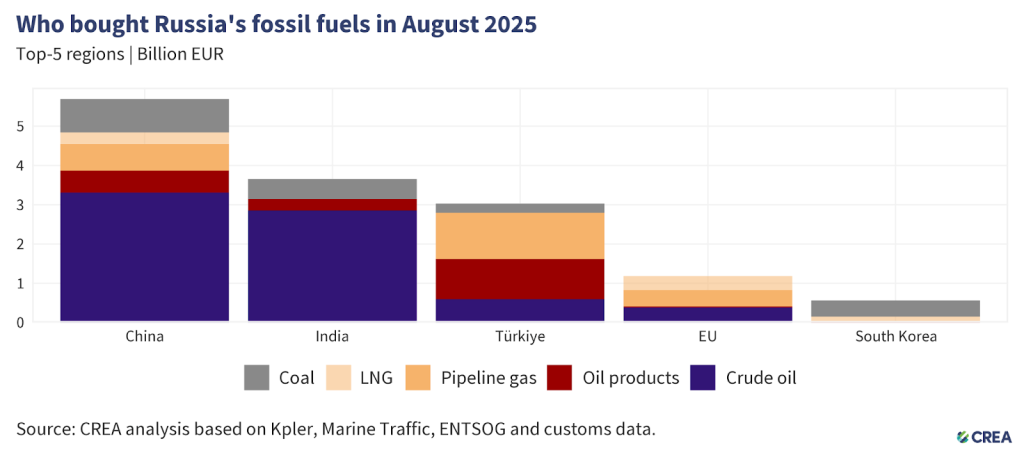 - In August 2025, China remained the largest global buyer of Russian fossil fuels, accounting for 40% (EUR 5.7 bn) of Russia’s export revenues from the top five importers. Crude oil made up the largest share of China’s purchases at 58% (EUR 3.1 bn), followed by coal at 15% (EUR 855 mn), pipeline gas at 12% (EUR 676 mn), and oil products at 10% (EUR 553 mn).