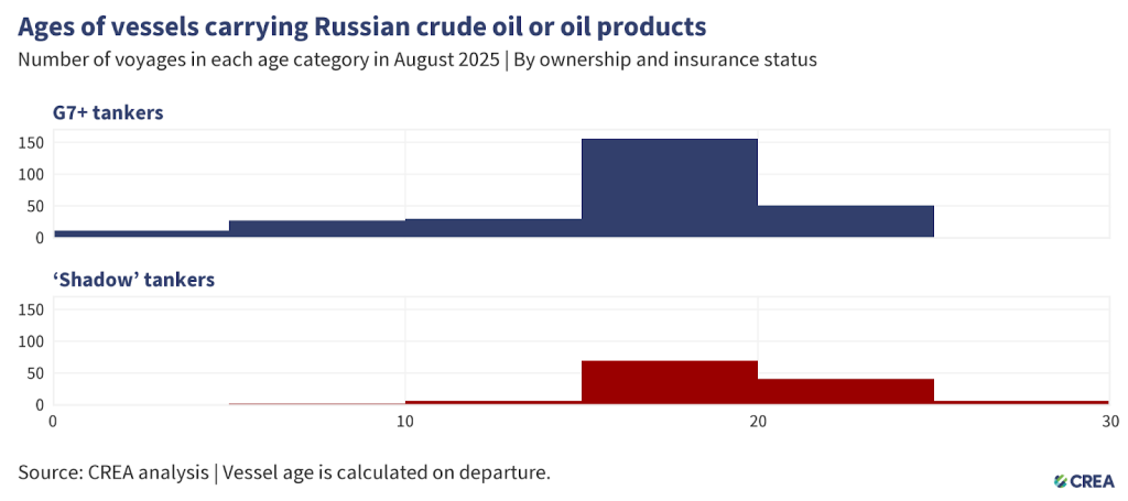 - In August 2025, 400 vessels exported Russian crude oil and oil products, of which 125 were ‘shadow’ tankers. Thirty-eight ‘shadow’ tankers were at least 20 years or older.