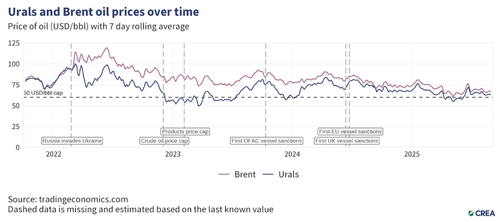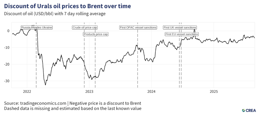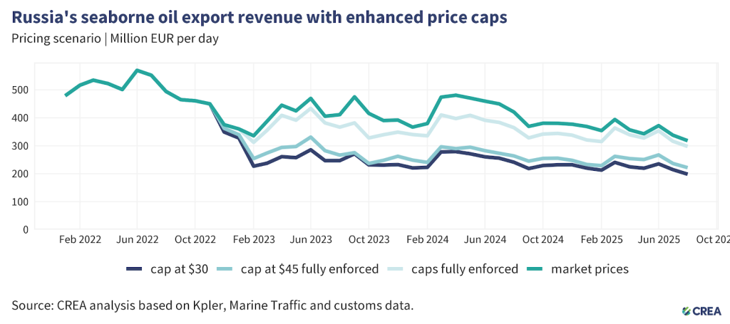 - Since introducing sanctions until the end of August 2025, thorough enforcement of the price cap would have cut Russia’s export revenues by 11% (EUR 40 bn). In August 2025 alone, full enforcement of the price cap would have reduced revenues by 6% (approximately EUR 0.68 bn).