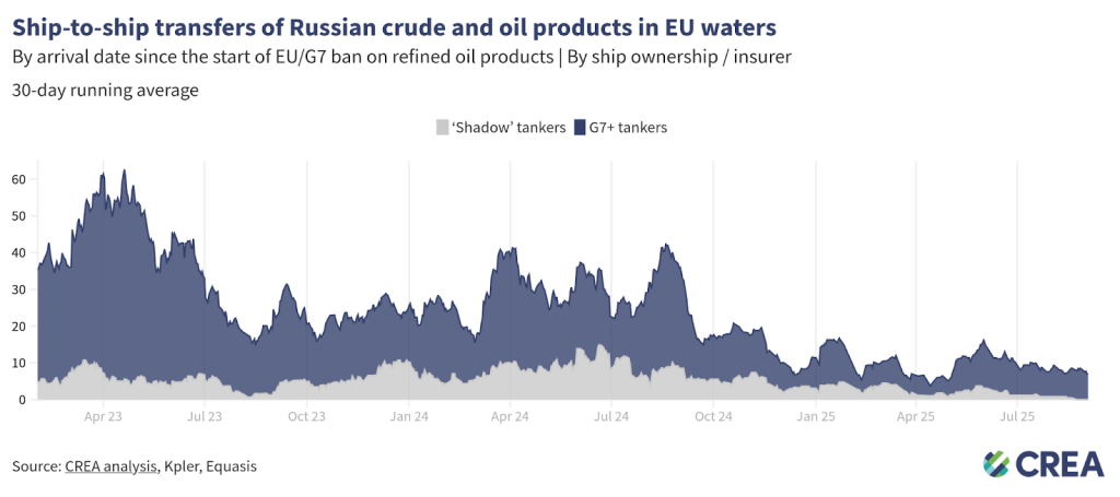 - In August 2025, an estimated EUR 121 mn worth of Russian oil was transferred daily via ship-to-ship (STS) transfers in EU waters — a 9% decrease from the previous month. G7+ tankers conducted 94% of these transfers, while the rest involved ‘shadow’ vessels, which are often uninsured or registered under flags of convenience.