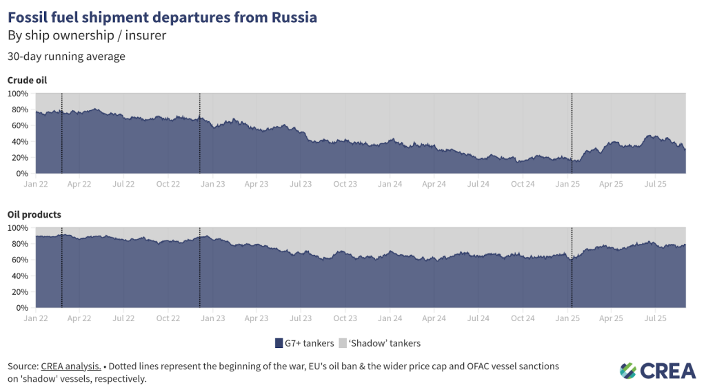 - In August 2025, just over half (53%) of Russian oil shipments were carried on G7+ tankers, an 8 percentage point decline from July — suggesting a renewed reliance on the ‘shadow’ fleet.