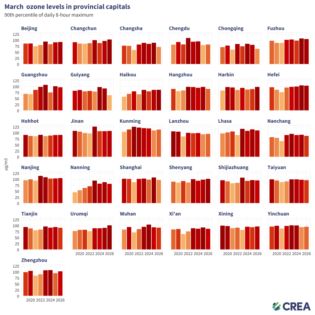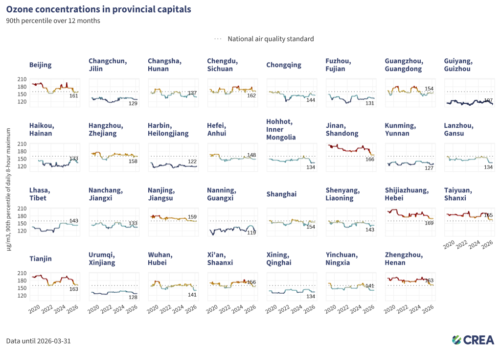 • As of the end of March 2026, seven out of 31 provincial capitals recorded 12-month 90th percentile ozone concentrations above the national standard of 160 µg/m³.