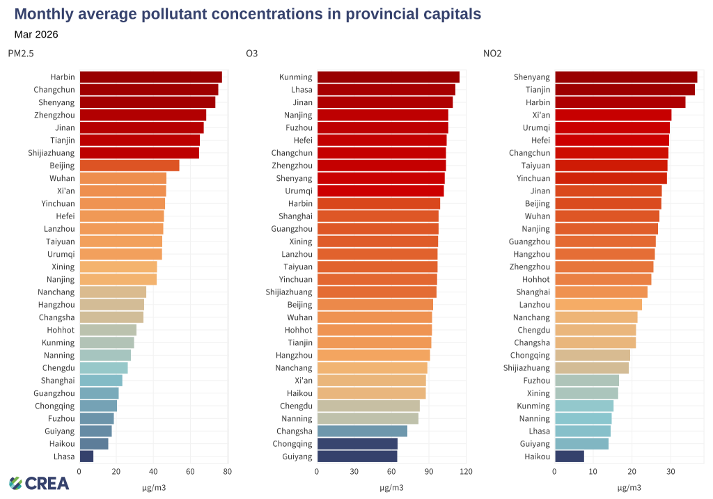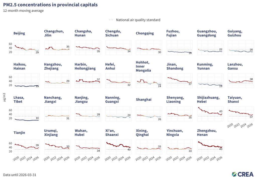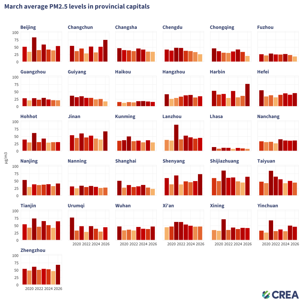 Air quality worsened across many of China’s provincial capitals in March 2026, with more cities failing the tightened annual PM2.5 standard, and monthly PM2.5 and ozone levels rising year-on-year in more than half of all provincial capitals.