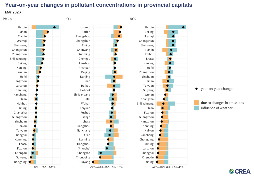 • Several cities with notable ozone increases also recorded marked rises in PM2.5, including Harbin (+9%), Zhengzhou (+8%), Jinan (+7%), and Changchun (+6%).
