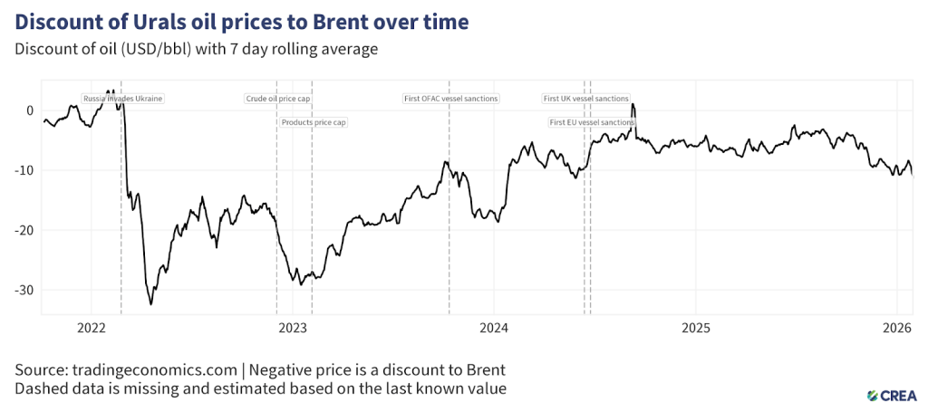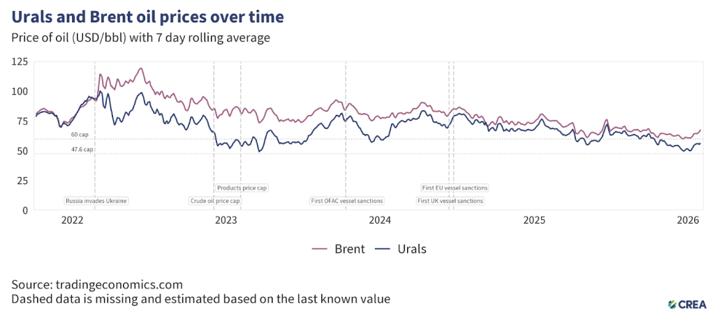 - In January 2026, the average price of Russia’s Urals crude rose by 4% to USD 54.2 per barrel, remaining above the new EU and UK price cap of USD 44.1 per barrel, which took effect on 1 February.