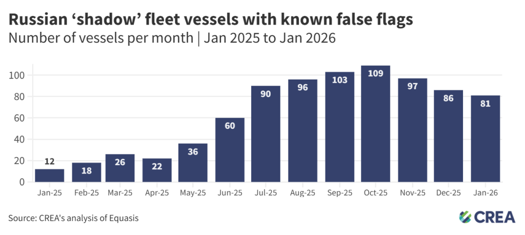- In January 2026, 81 ‘shadow’ vessels were operating under false flags at the end of the month. Thirty-five vessels delivered EUR 1.3 bn of Russian crude oil and oil products while flying a false flag.