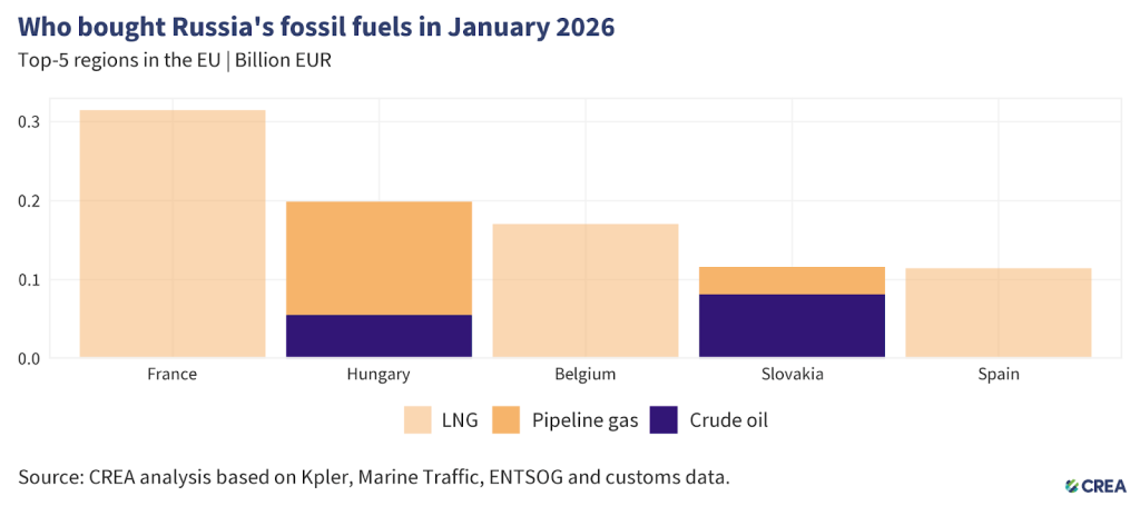 - In January 2026, the five largest EU importers of Russian fossil fuels paid Russia a combined EUR 915 mn. Natural gas — unsanctioned by the EU — accounted for 85% of these imports, delivered mainly by pipeline or as liquefied natural gas (LNG). The remainder constituted crude oil, which continues to reach Hungary and Slovakia via the southern branch of the Druzhba pipeline under an EU exemption.