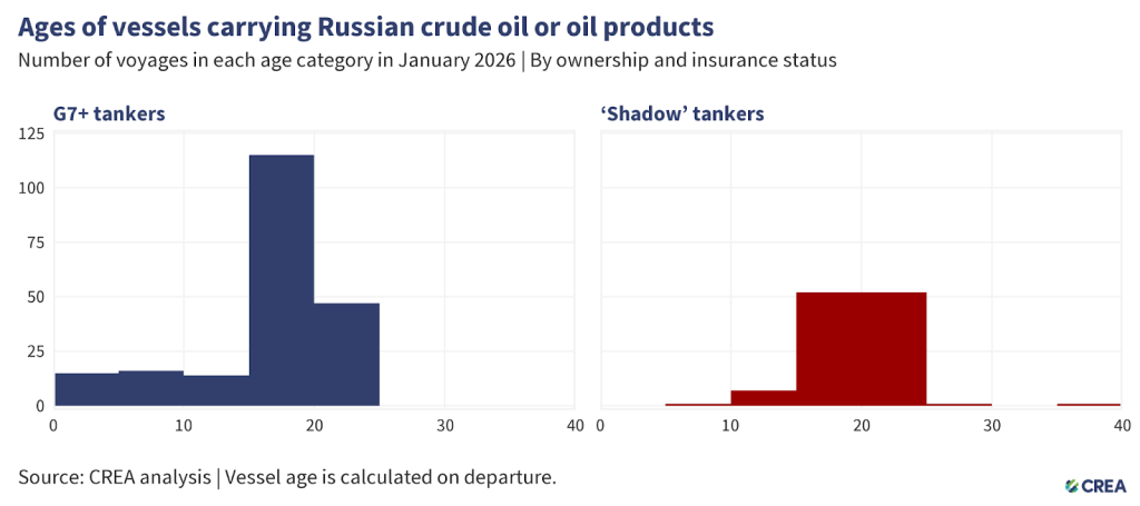 - In January 2026, 321 vessels exported Russian crude oil and oil products. Among them, 207 were G7+ tankers, and the remaining 114 were ‘shadow’ tankers. Additionally, 54 of these ‘shadow’ tankers were at least 20 years old or older.