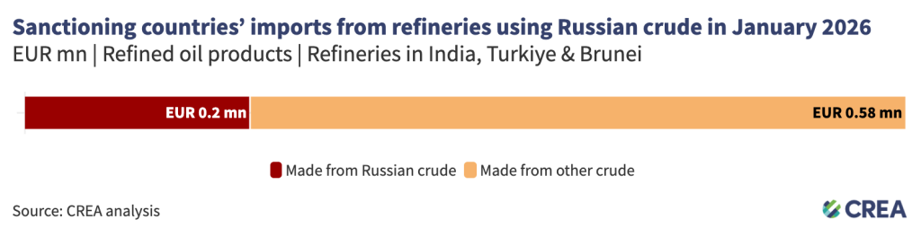 - Five refineries in India, Turkiye, and Brunei that use Russian crude exported EUR 781 mn of oil products to sanctioning countries in January 2026. The importers included the EU (EUR 309 mn), USA (EUR 118 mn), UK (EUR 24 mn), and Australia (EUR 330 mn). An estimated EUR 200 mn of these products were refined from Russian crude.