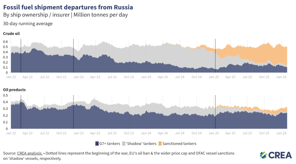 At the same time, Russia has built a large ‘shadow’ fleet that now carries the majority of crude exports, reducing reliance on Western services. In January 2026, only 24% of Russian crude oil exports were transported by G7+ tankers, while 68% were carried by sanctioned ‘shadow’ vessels. This shift demonstrates that the price cap has neither constrained export volumes nor prevented Russia from selling crude above the cap through alternative logistics and buyers.