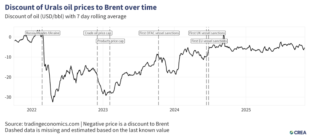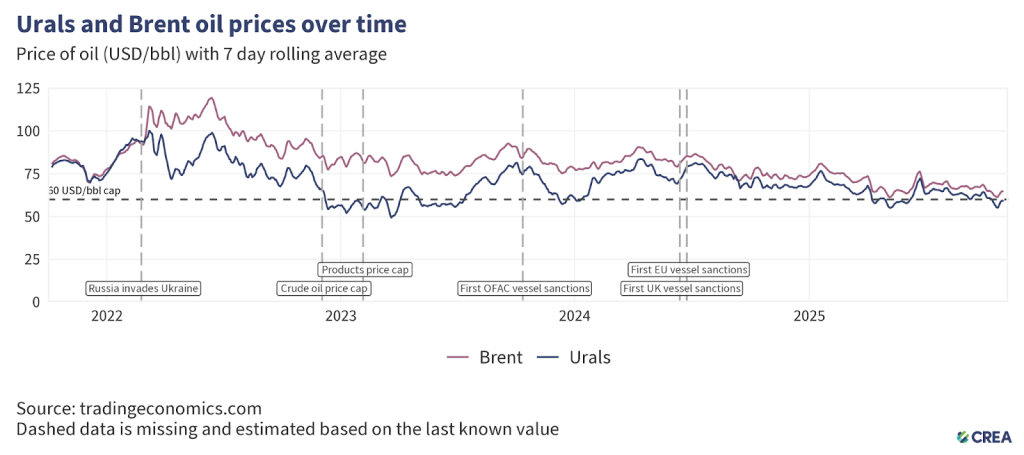 • In October 2025, the average price of Russia’s Urals crude fell by 4% to USD 59 per barrel, remaining above the new price cap of USD 47.6 per barrel.