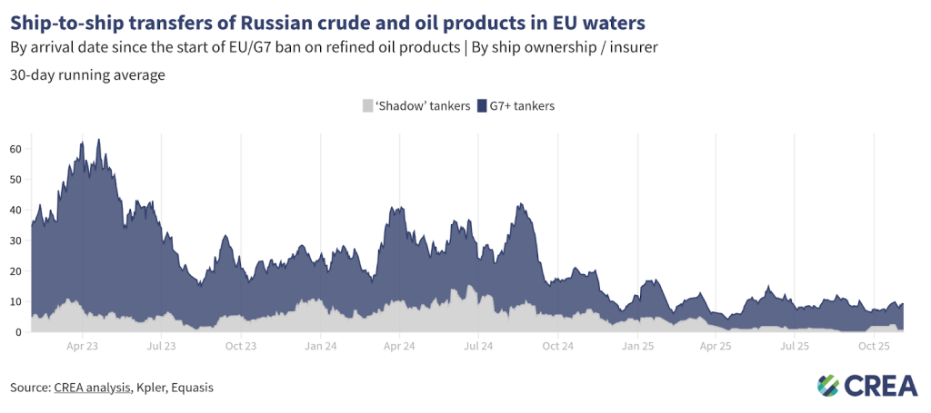 • In October 2025, an estimated EUR 112 mn worth of Russian oil was transferred daily via ship-to-ship (STS) transfers in EU waters — a 35% month-on-month increase. G7+ tankers conducted 80% of these transfers, while the rest involved ‘shadow’ vessels, which are often uninsured or registered under flags of convenience.