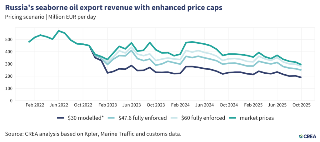 • A lower price cap of USD 30 per barrel would have slashed Russia’s oil export revenue by 40% from the start of the EU sanctions in December 2022 until the end of October 2025. In October alone, a USD 30 per barrel price cap would have slashed Russian revenues by 36%.