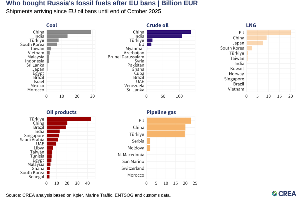 • Russia’s fossil fuel exports remain highly concentrated, with China dominating coal and crude oil purchases, Turkiye dominating purchases of oil products, and the EU still the largest buyer of LNG and pipeline gas — showing Moscow’s dependence on a narrow set of key customers.