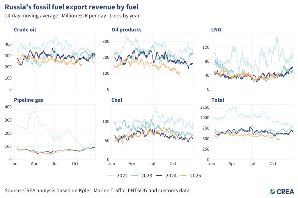 • In October 2025, Russia’s monthly fossil fuel export revenues saw a 4% month-on-month decline to EUR 524 million (mn) per day — the lowest they have been since the full-scale invasion of Ukraine.