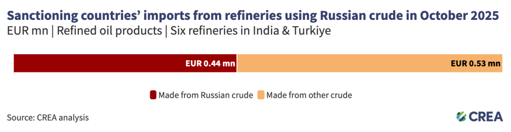 • In October, the EU, Australia, the UK and the US imported EUR 971 mn of refined products from six Indian and Turkish refineries using Russian crude. An estimated EUR 443 mn of these products were refined from Russian crude.