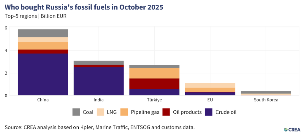 • In October 2025, China remained the largest global buyer of Russian fossil fuels, accounting for 44% (EUR 5.8 bn) of Russia’s export revenues from the top five importers. Crude oil made up 63% (EUR 3.7 bn) of China’s purchases, followed by coal at 12% (EUR 704 mn), pipeline gas at 11% (EUR 668 mn), LNG at 7% (EUR 487 mn), and oil products at 6% (EUR 355 mn).