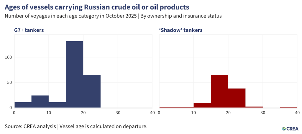 • In October 2025, 360 vessels exported Russian crude oil and oil products, of which 117 were ‘shadow’ tankers. Forty-one ‘shadow’ tankers were at least 20 years or older.