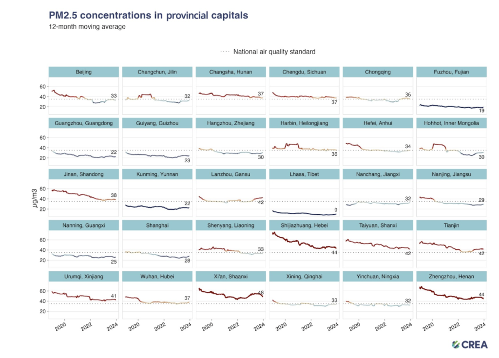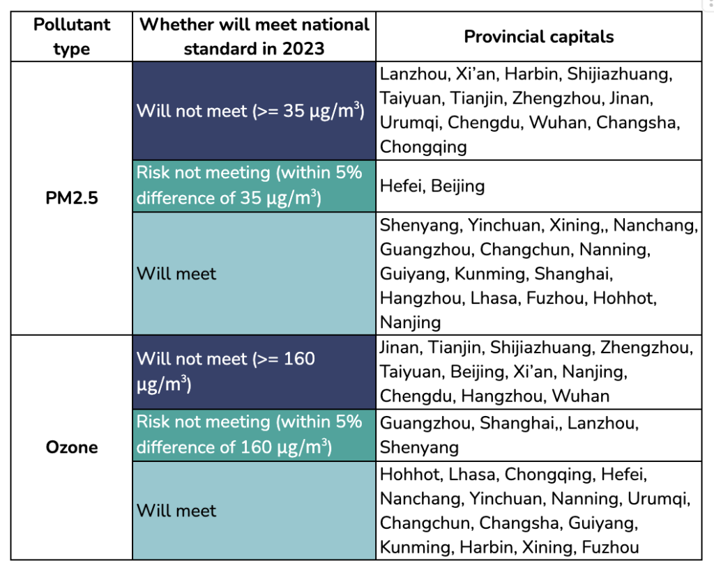 - In 2023, 13 out of China’s 31 provincial capitals have not met the national standard for PM2.5, and 11 provincial capitals have not met the standard for ozone. They are concentrated in the northern key air pollution control regions and in central China.
