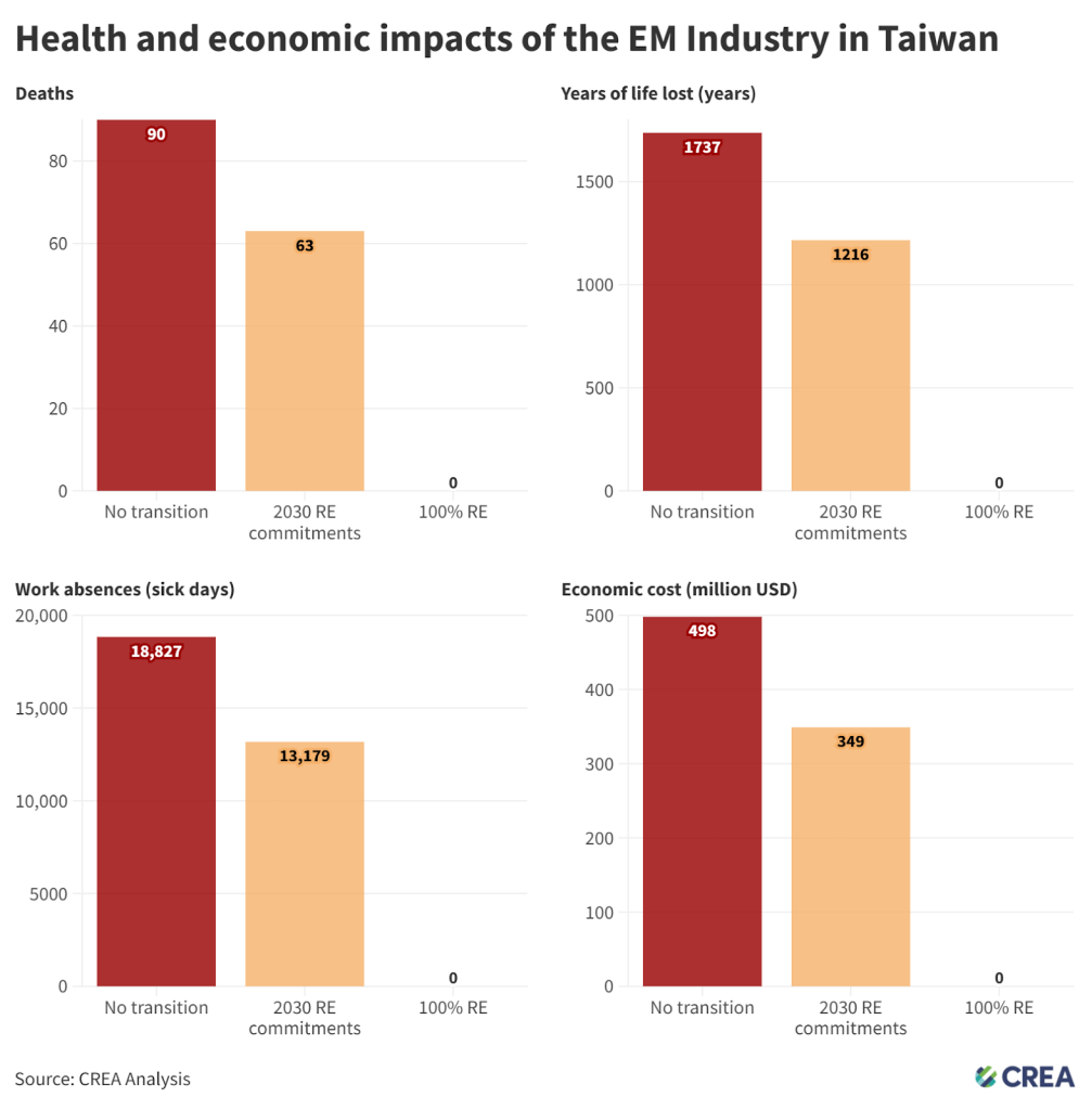 - Under a “current-mix” scenario, assuming renewable energy (RE) procurement by Taiwan EM companies persists at the 2023 level, we estimate that air pollution attributable to Taiwan’s EM industry in 2030 would be linked to 90 premature deaths, 277 children suffering from asthma, nearly 19,000 work absences, and almost USD 500 million in health-related economic damages.