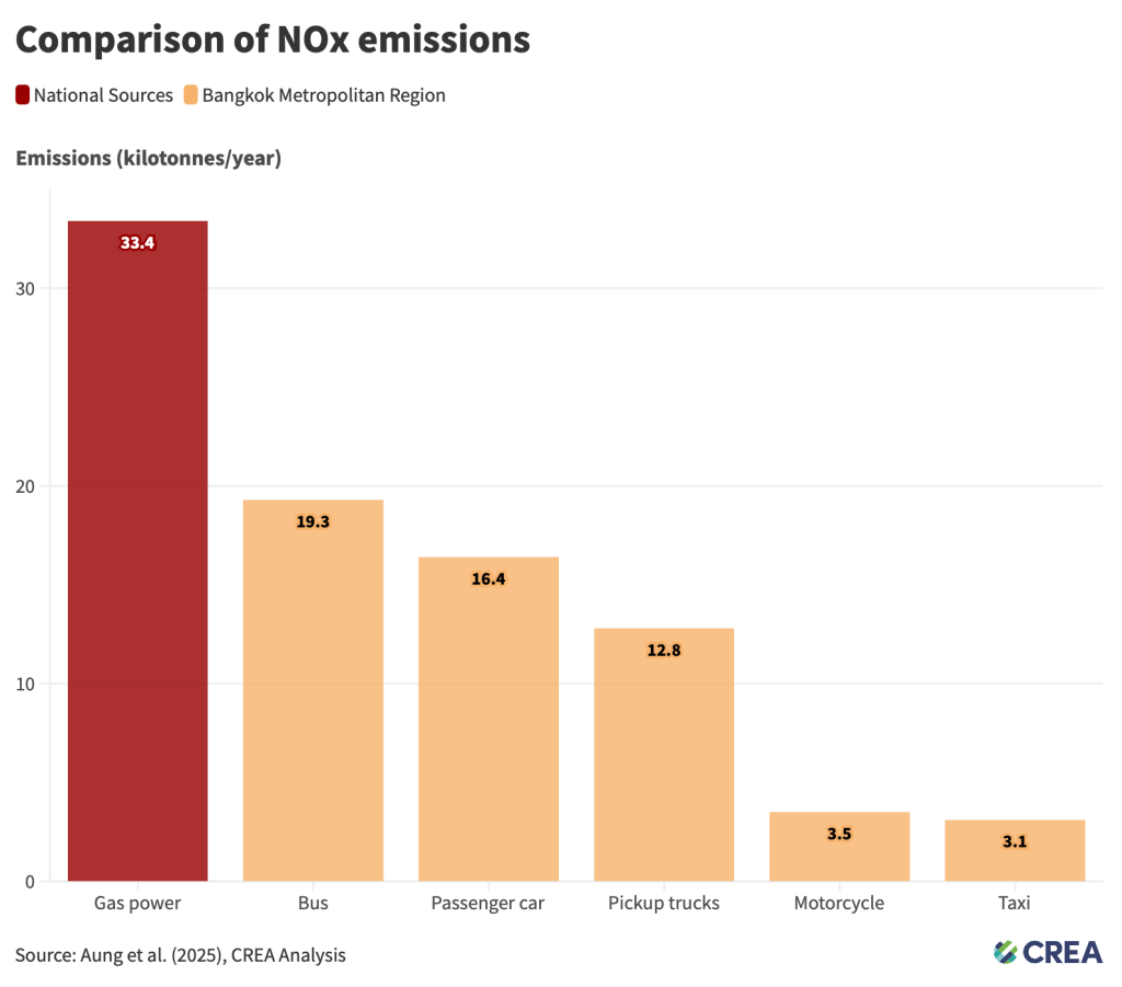 The NOX emissions from Thailand’s gas power plants exceed the combined emissions from buses, motorcycles, and taxis in Bangkok Metropolitan Region (25.9 kt).