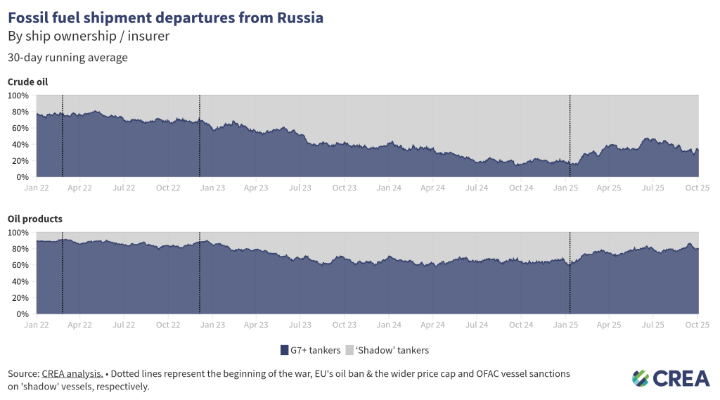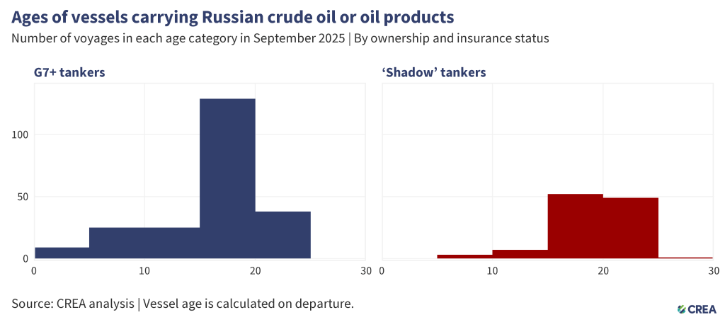 - In September 2025, 338 vessels exported Russian crude oil and oil products, of which 112 were ‘shadow’ tankers. Fifty ‘shadow’ tankers were at least 20 years or older.