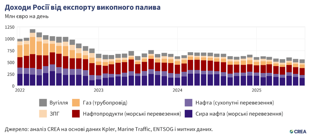• У серпні місячні доходи Росії від експорту викопного палива знизились на 2% порівняно з попереднім місяцем, до 564 млн євро на день. Доходи Росії від експорту викопного палива скорочуються третій місяць поспіль.