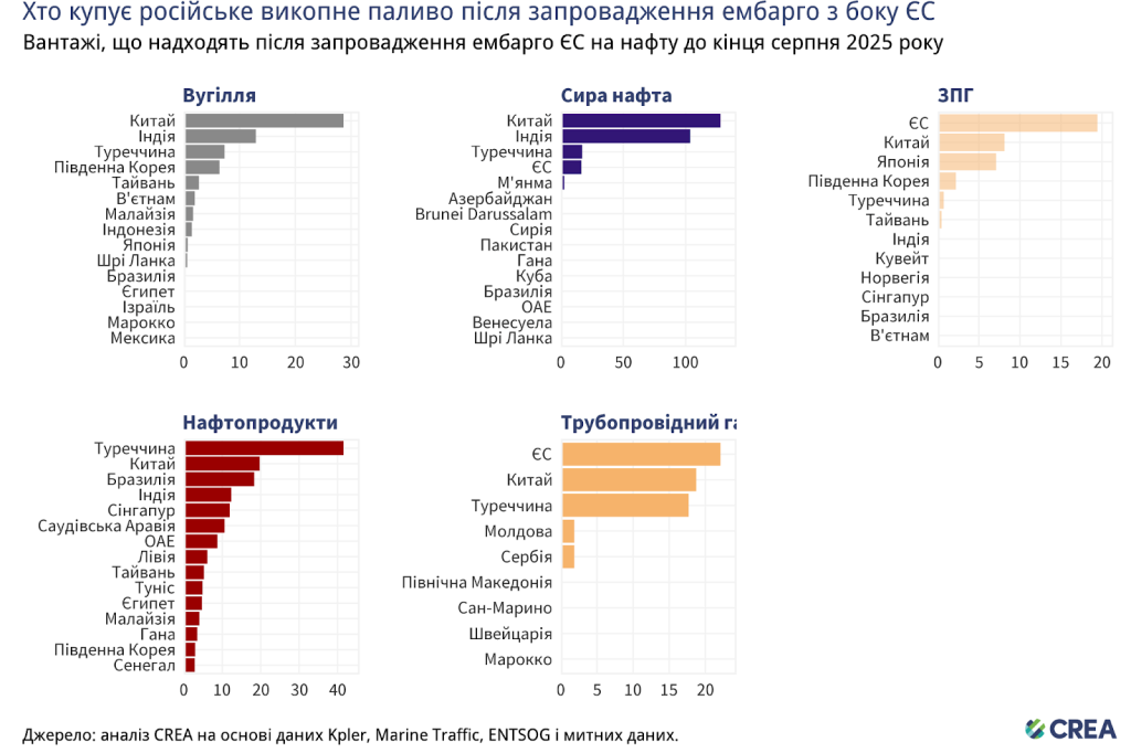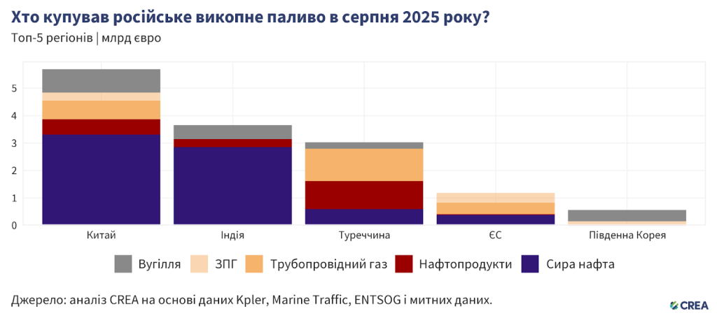 • У серпні 2025 року п’ять найбільших імпортерів російського викопного палива в ЄС разом заплатили Росії 979 млн євро за викопне паливо.