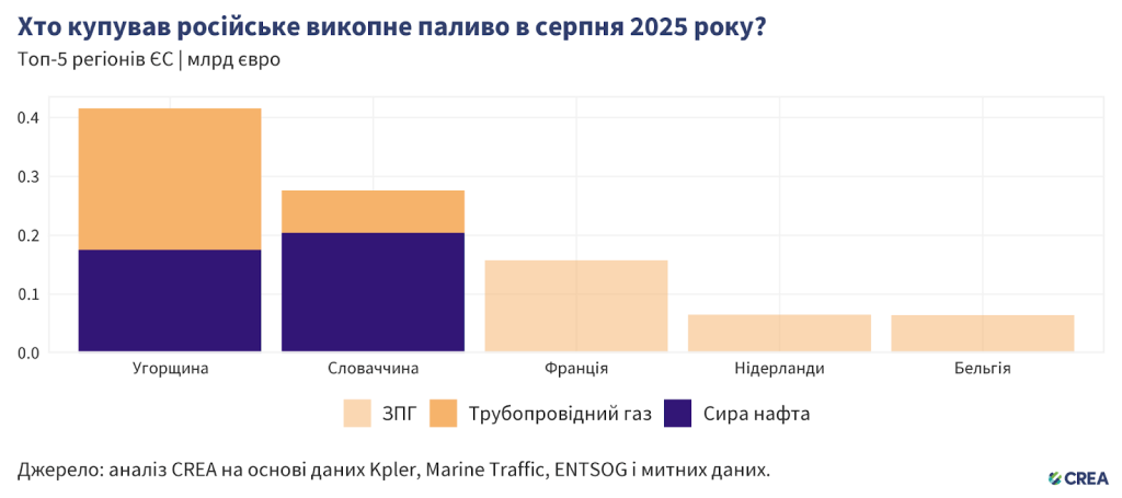 • У серпні 2025 року п’ять найбільших імпортерів російського викопного палива з ЄС разом заплатили Росії 979 млн євро за викопне паливо. Природний газ, на який ЄС не наклав санкції і який постачається переважно трубопроводами або у вигляді ЗПГ, склав понад 61% цього імпорту. Решту становила переважно сира нафта, яка продовжує надходити до Угорщини та Словаччини південною гілкою трубопроводу «Дружба» згідно з наданим ЄС винятком.
