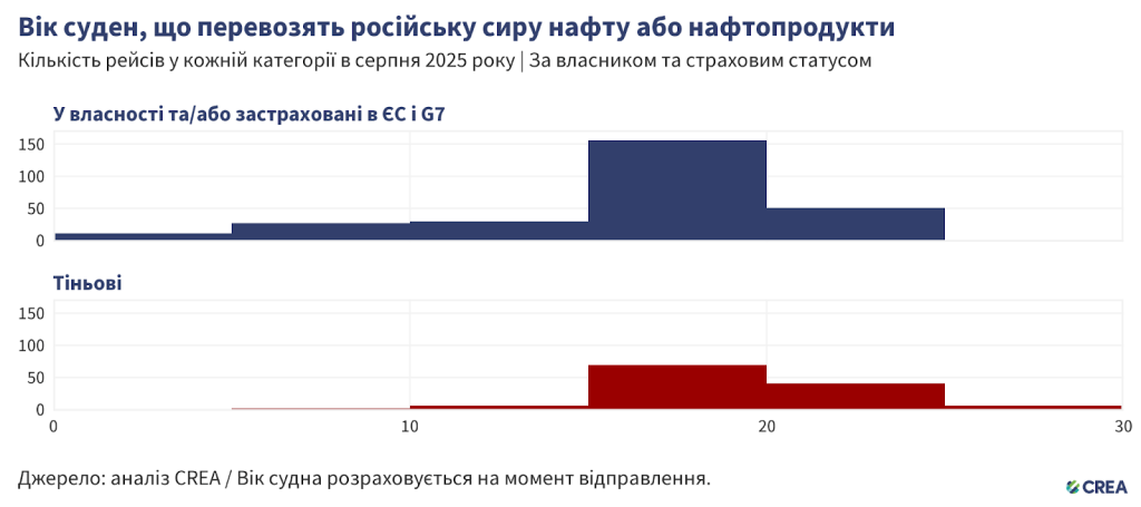 • У серпні 2025 року російську сиру нафту та нафтопродукти перевозили 400 суден, 125 з яких були «тіньовими». 38 «тіньових» танкерів мали вік щонайменше 20 років.
