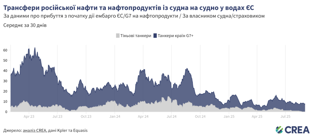 • За попередніми оцінками, у серпні 2025 року у водах ЄС було здійснено щоденні STS-трансфери російської нафти на суму 121 млн євро, що на 9% менше, ніж попереднього місяця. 94% цих трансферів забезпечили танкери країн G7+, а решту — «тіньові» судна, що часто не мають страхування або зареєстровані під зручними прапорами.
