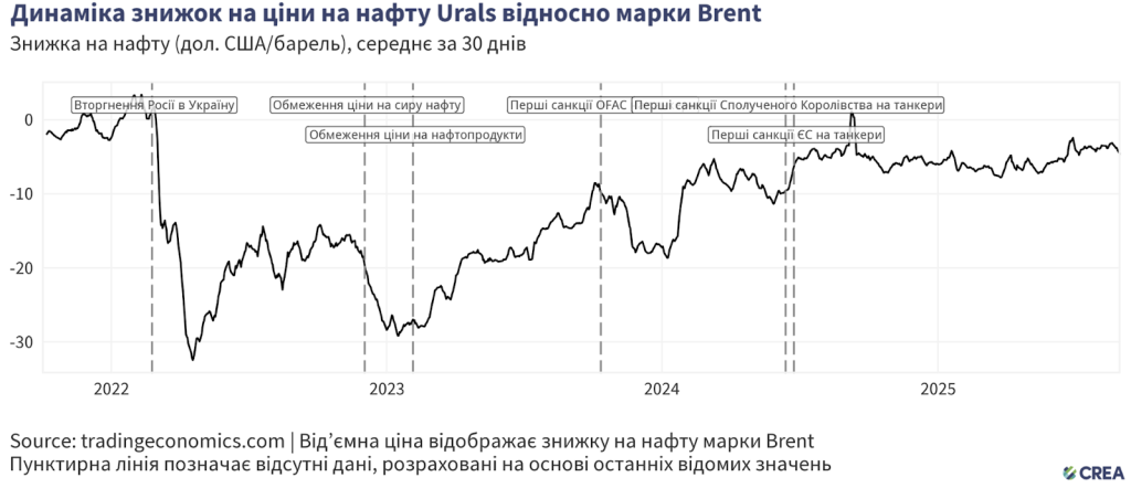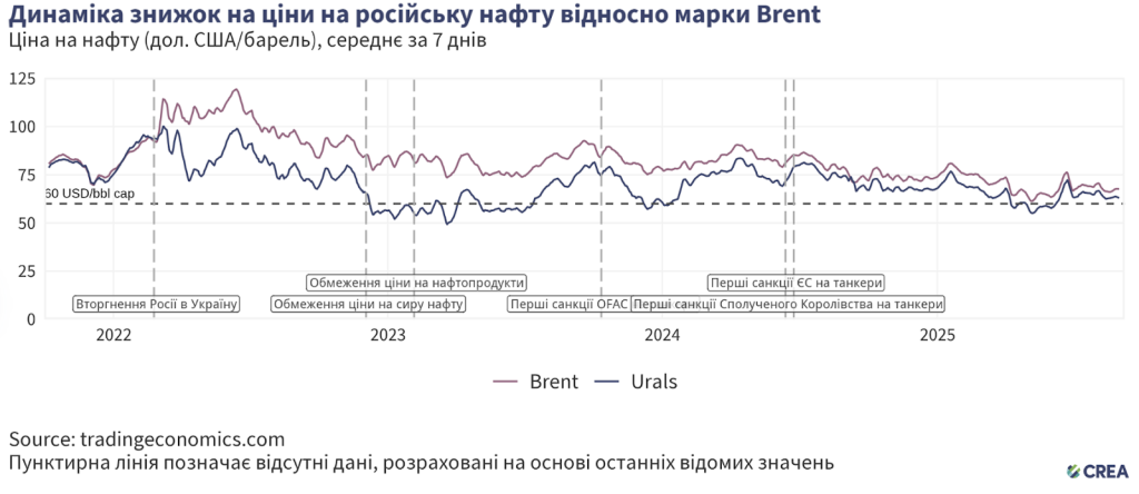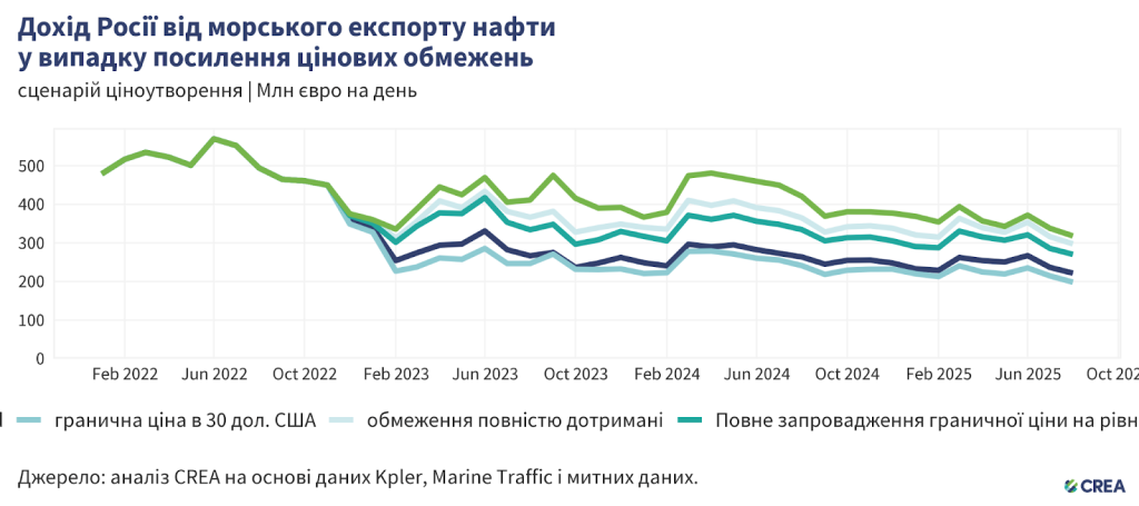 • З моменту запровадження санкцій і до кінця серпня 2025 року повне дотримання політики обмеження ціни скоротило б доходи Росії на 11% (40 млрд євро). Лише у серпні 2025 року повне дотримання цієї політики зменшило б доходи Росії на 6% (приблизно 0,68 млрд євро).