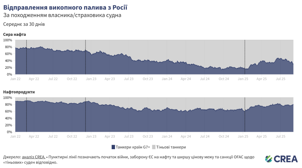 • У серпні 2025 року Росія експортувала 25 млн тонн нафти морем. Танкери країн G7+ перевезли російської нафти лише трохи більше половини, 53%. Це на 8 відсоткових пунктів менше, ніж у липні, що свідчить про відновлення залежності від «тіньового» флоту.
