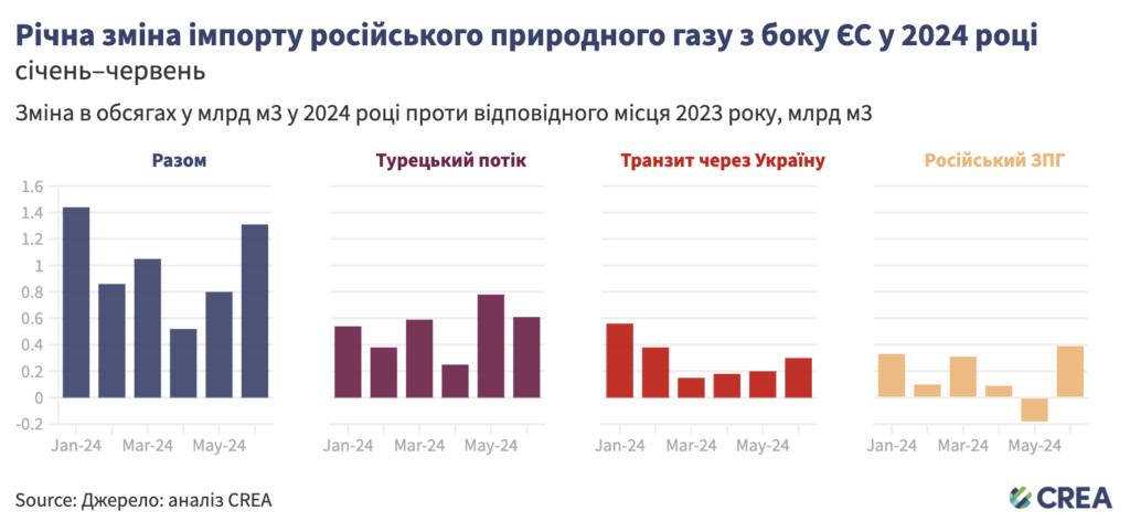 | Попри узгоджені зусилля Європейського Союзу щодо зменшення його залежності від російського природного газу після повномасштабного вторгнення Росії в Україну, в першій половині 2024 року імпорт ЄС з Росії зріс на 27% порівняно з аналогічним періодом минулого року та забезпечив Росії 8,7 млрд євро доходів. Такий сплеск поглибив залежність ЄС від російського газу. За перші шість місяців цього року імпорт із Росії склав 20% від загального споживання природного газу в ЄС (разом із операціями з перевантаження), що на 4 відсоткові пункти більше, ніж минулого року. Хоча деякі країни ЄС прагнуть запровадити санкції проти російського ЗПГ, у першій половині року імпорт ЗПГ блоком збільшився на 9% проти минулого року. Цьогоріч російський ЗПГ становить 43% від загального імпорту російського газу з боку ЄС. Решта імпортованого країнами ЄС природного газу з Росії надходила транзитом через Україну та газопроводом «Турецький потік», й імпорт значно зріс. Порівняно з минулим роком імпорт газу, що надходить до ЄС через газопровід «Турецький потік», збільшився на 64%, а імпорт через Україну — на 30%. |