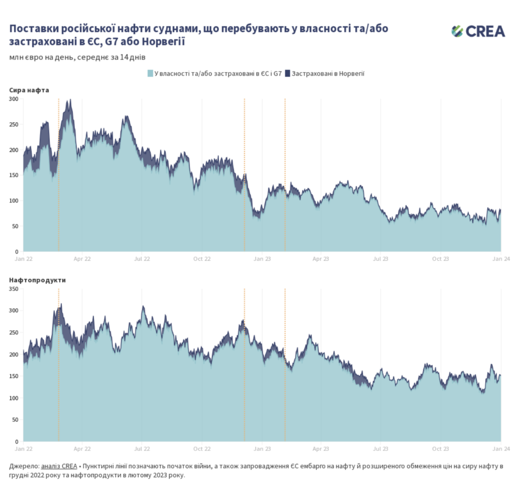 На танкери, що належать європейським країнам чи країнам G7 або застраховані в них, було завантажено викопне паливо на суму 1,26 млрд євро, що сприяє фінансуванню вторгнення Росії в Україну.