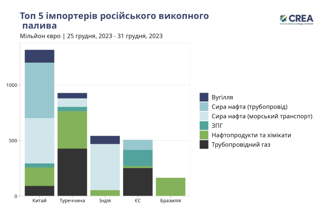 За попередніми оцінками, минулого тижня Росія здійснила експорт викопного палива на 4,35 млрд євро, а саме: нафти — на 1,5 млрд євро, нафтопродуктів і хімікатів — на 1,42 млрд євро, газу — на 1,09 млрд євро та вугілля — на 0,35 млрд євро.