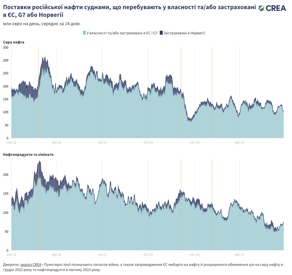 На танкери, що належать європейським країнам чи країнам G7 або застраховані в них, було завантажено викопне паливо на суму 0,98 млрд євро, що сприяє фінансуванню вторгнення Росії в Україну.