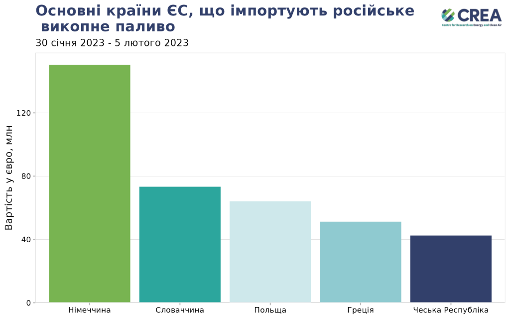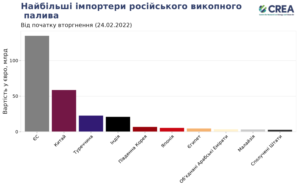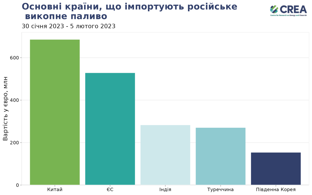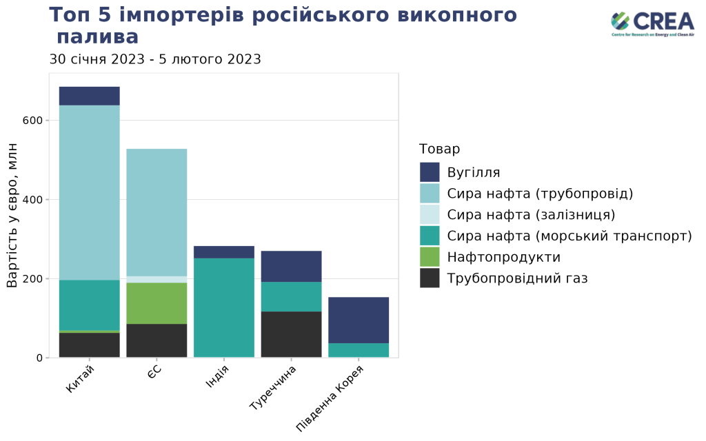 Китай минулого тижня обігнав ЄС як найбільшого імпортера російського викопного палива. Іншими імпортерами в першій п’ятірці були Індія, Туреччина та Південна Корея.