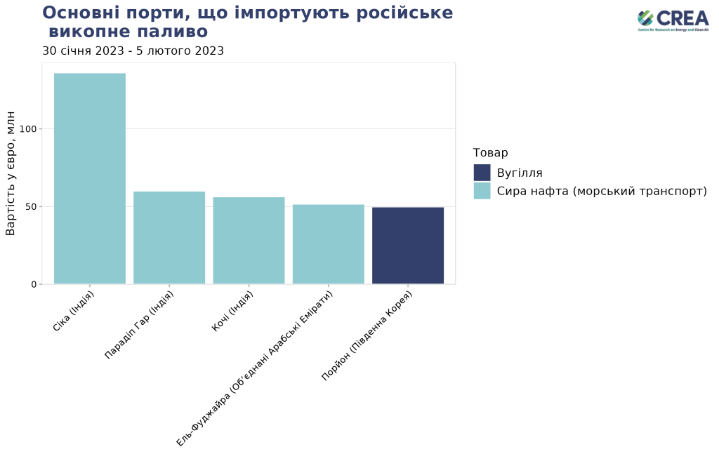 Три з п’яти найбільших портів, що імпортують російське викопне паливо, розташувались в Індії, а їхнім імпортним товаром була сира нафта. Один порт знаходився в ОАЕ та імпортував сиру нафту, і один — у Південній Кореї та імпортував вугілля.