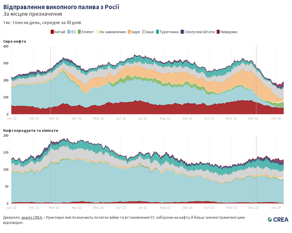 Імпорт Китаю охоплював сиру нафту, трубопровідний газ, вугілля та нафтопродукти. ЄС імпортував трубопровідну нафту та газ, нафтопродукти й сиру нафту залізницею. Заборона на нафтопродукти набула чинності 5 лютого. Індія та Південна Корея імпортували сиру нафту та вугілля, а Туреччина — суміш трубопровідного газу, сирої нафти й вугілля.